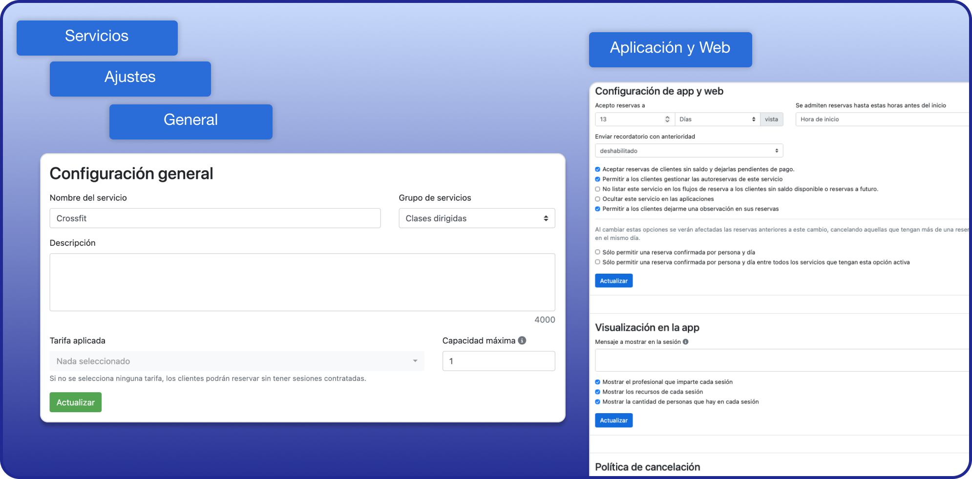La tarifa y la capacidad se encuentran ahora en la configuración general del servicio. También se han ordenado los formularios de app y web, con el fin tener la información de tus servicios merjor organizada y accesible.