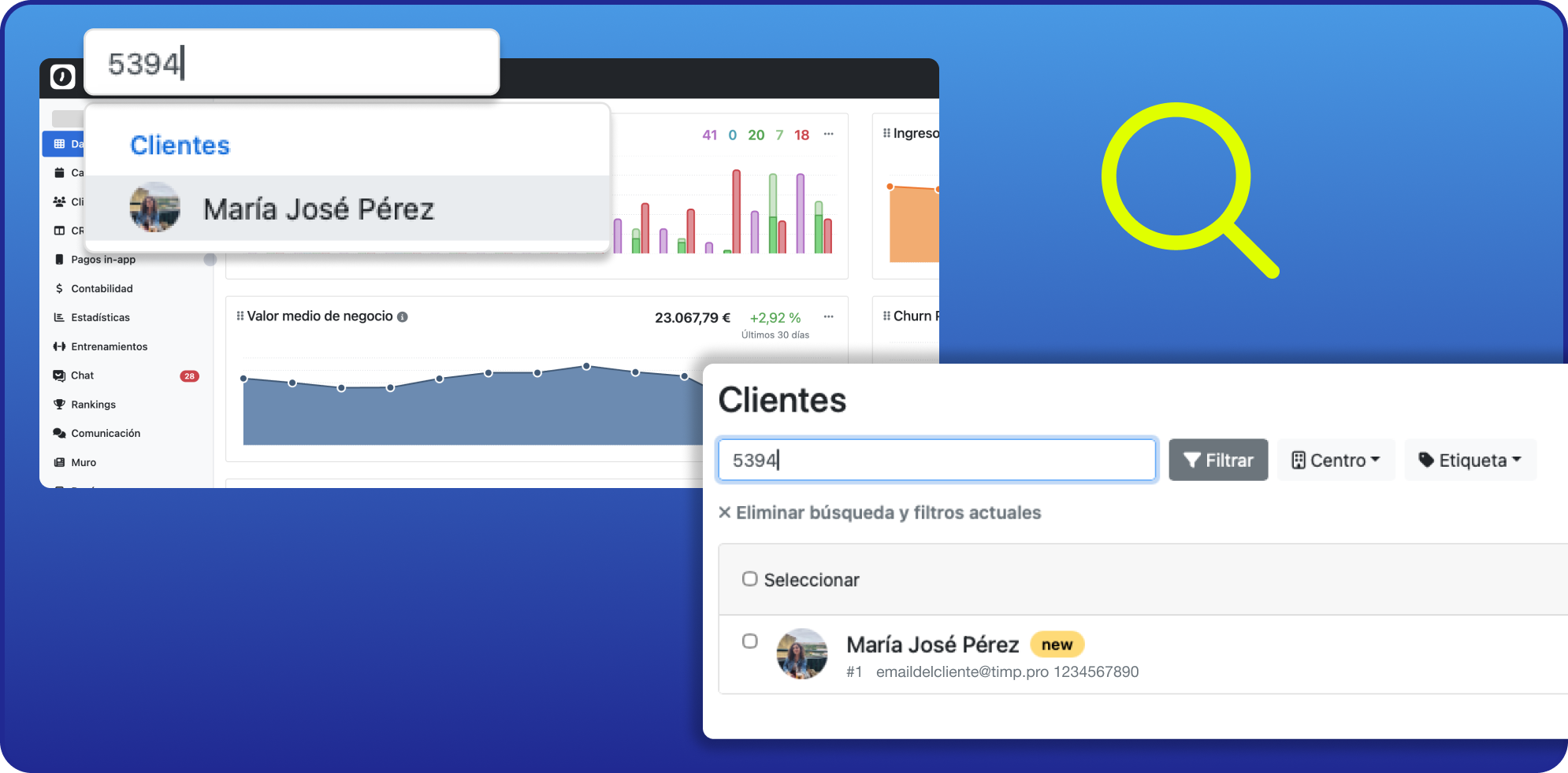 En el buscador general del Panel (arriba a la izquierda) y en el listado de Clientes puedes buscar a alguien, además de por nombre, correo o teléfono, por su NIF.