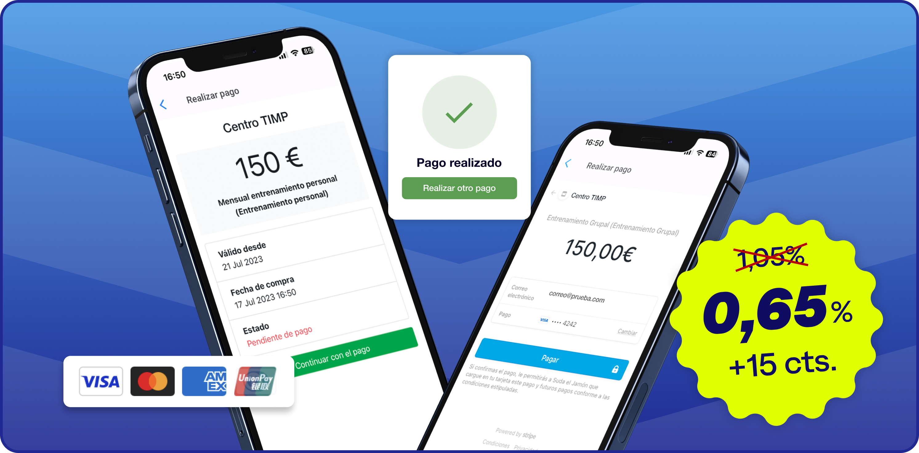 Las comisiones por cada cobro realizado con nuestro método de pago in-app bajan al 0,65% (+15 cts). Esta reducción tiene una duración de 6 meses y podrá mantenerse para los centros que tengan un mínimo de facturación in-app. El porcentaje de facturación necesario variará según centros. Comunicaremos toda la información necesaria para poder cumplirlo y seguir disfrutando de las comisiones bajas.