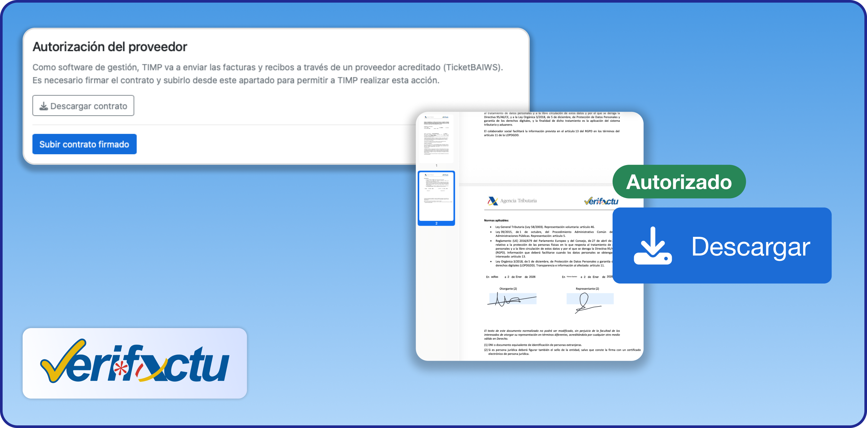 Se ha añadido el apartado Autorización del proveedor para aquellos que trabajen con Verifactu. Ahora, se puede descargar un documento que acredita a TIMP a enviar facturas y recibos a través del proveedor de TicketBAIWS y que tienen que subir los gestores del centro firmado digitalmente.