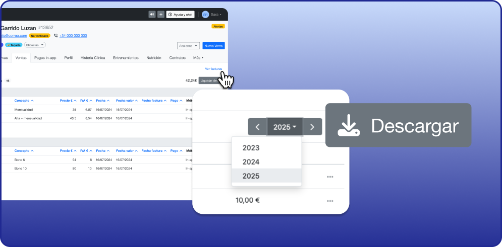 Al acceder, ves las facturas del año en curso, un filtro para cambiar de año y un botón para descargar. Puedes guardarte una factura en concreto o, si lo prefieres, descargar una carpeta con las de todo el año que tengas seleccionado.