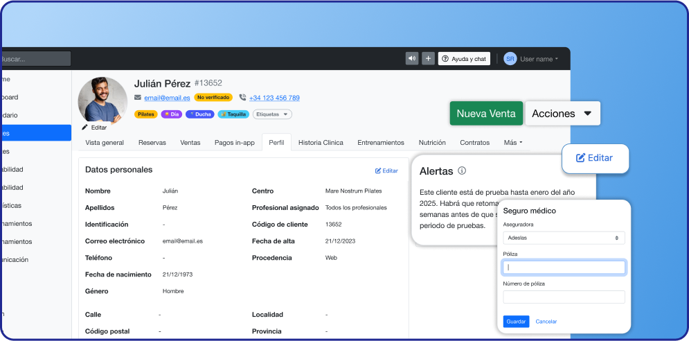 - Las secciones de Datos personales, Alertas y Seguro médico, dentro de la pestaña de Perfil, ahora tienen un modo de visualización de los datos y un modo de edición. Para editar los datos se puede hacer clic en "editar" y después guardar los cambios.