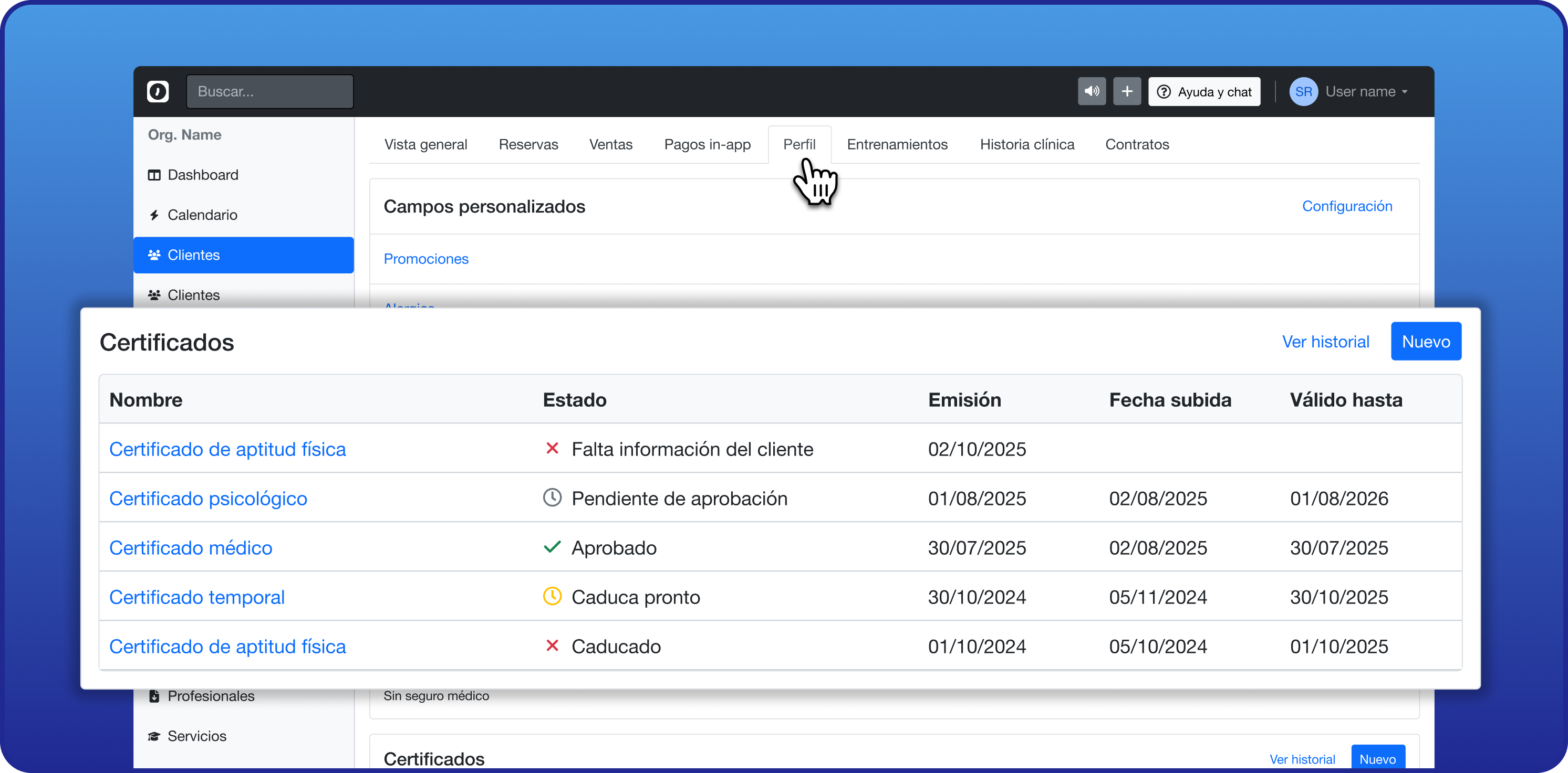 En la pestaña de Perfil de un cliente, se ha añadido un apartado de Certificados. Con esta mejora, puedes solicitar certificados a tus clientes, ya sean de aptitud física, médicos, psicológicos, académicos, etc.