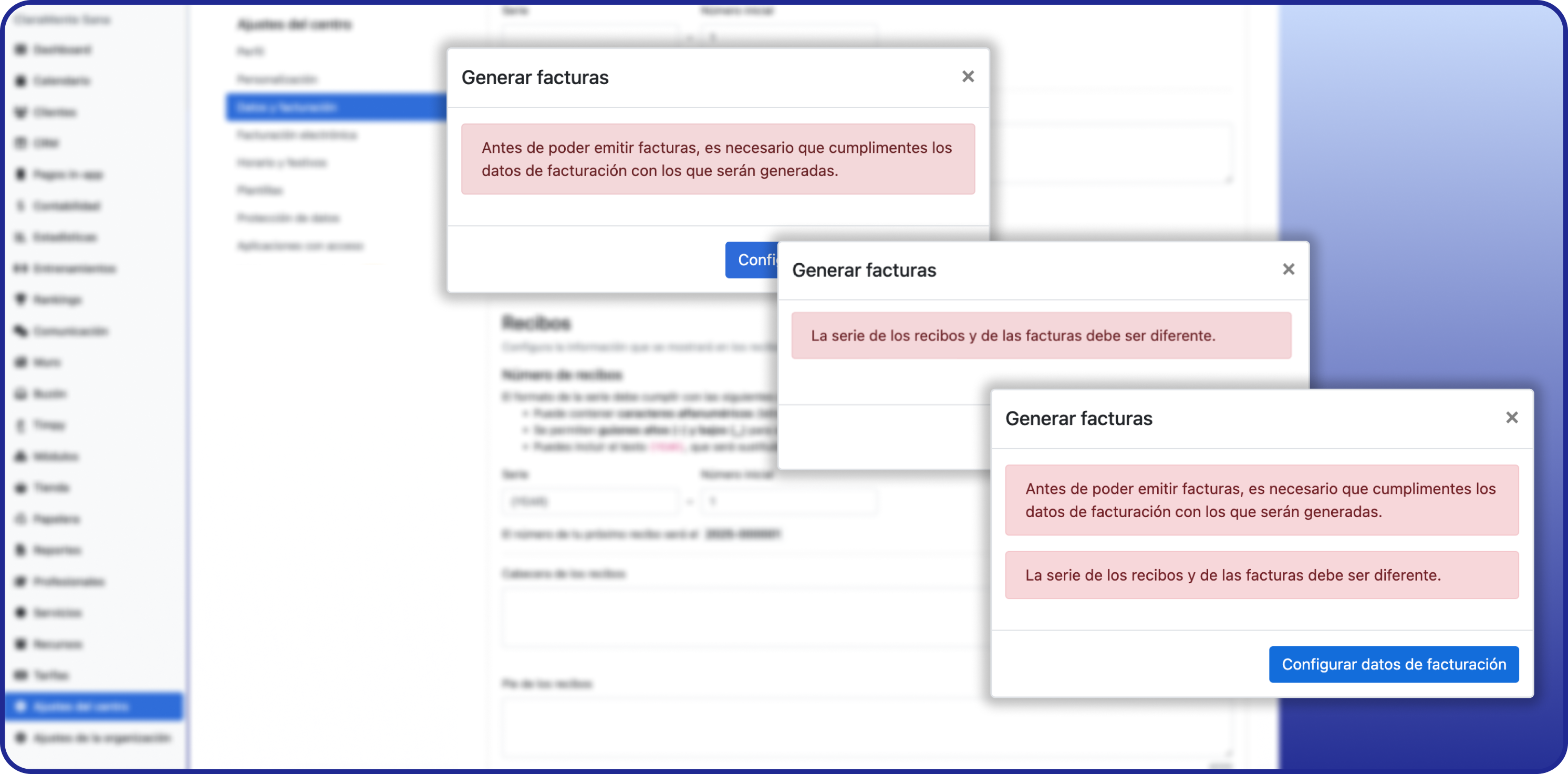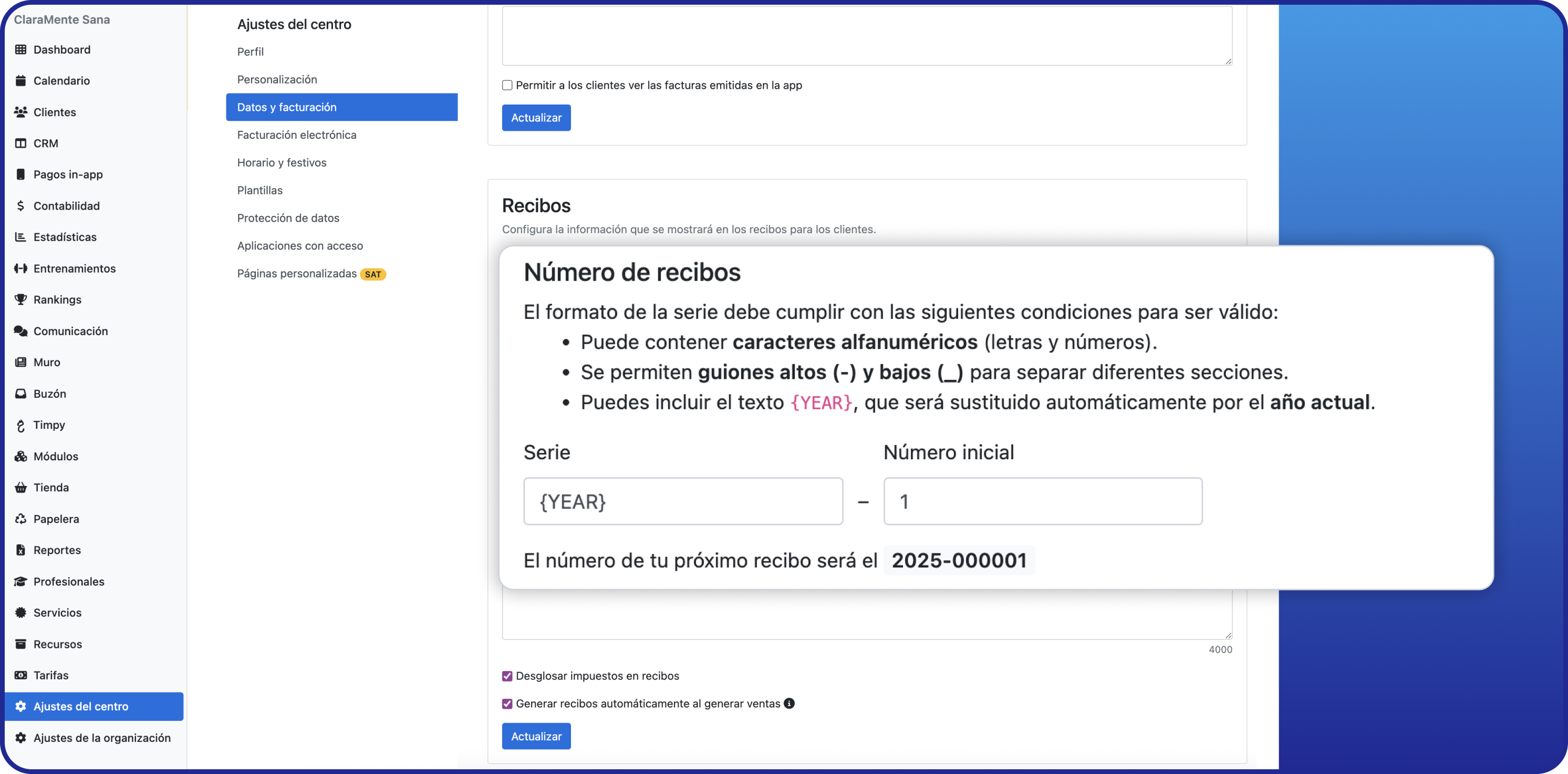 Hasta ahora los recibos se generaban con la numeración del año en curso. Desde este momento, hay un nuevo apartado en Ajustes del centro > Datos y facturación para que se pueda modificar la serie.